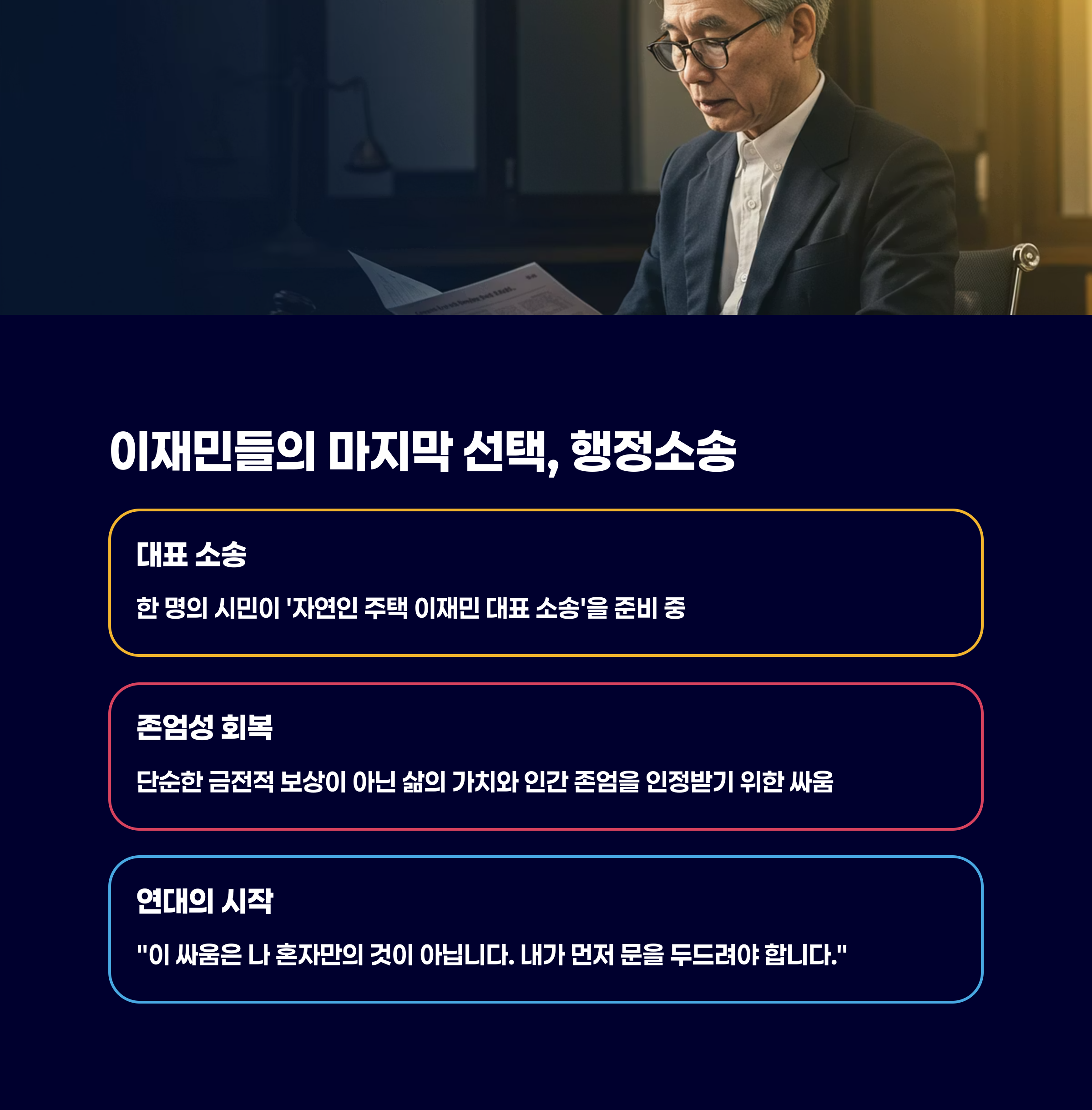 이른바 ‘자연인 주택 이재민 대표 소송’이라 불릴 이 행정소송은 단지 금전적 보상을 받기 위한 것이 아닙니다. 그것은 삶의 가치와 인간의 존엄을 인정받기 위한 싸움입니다.