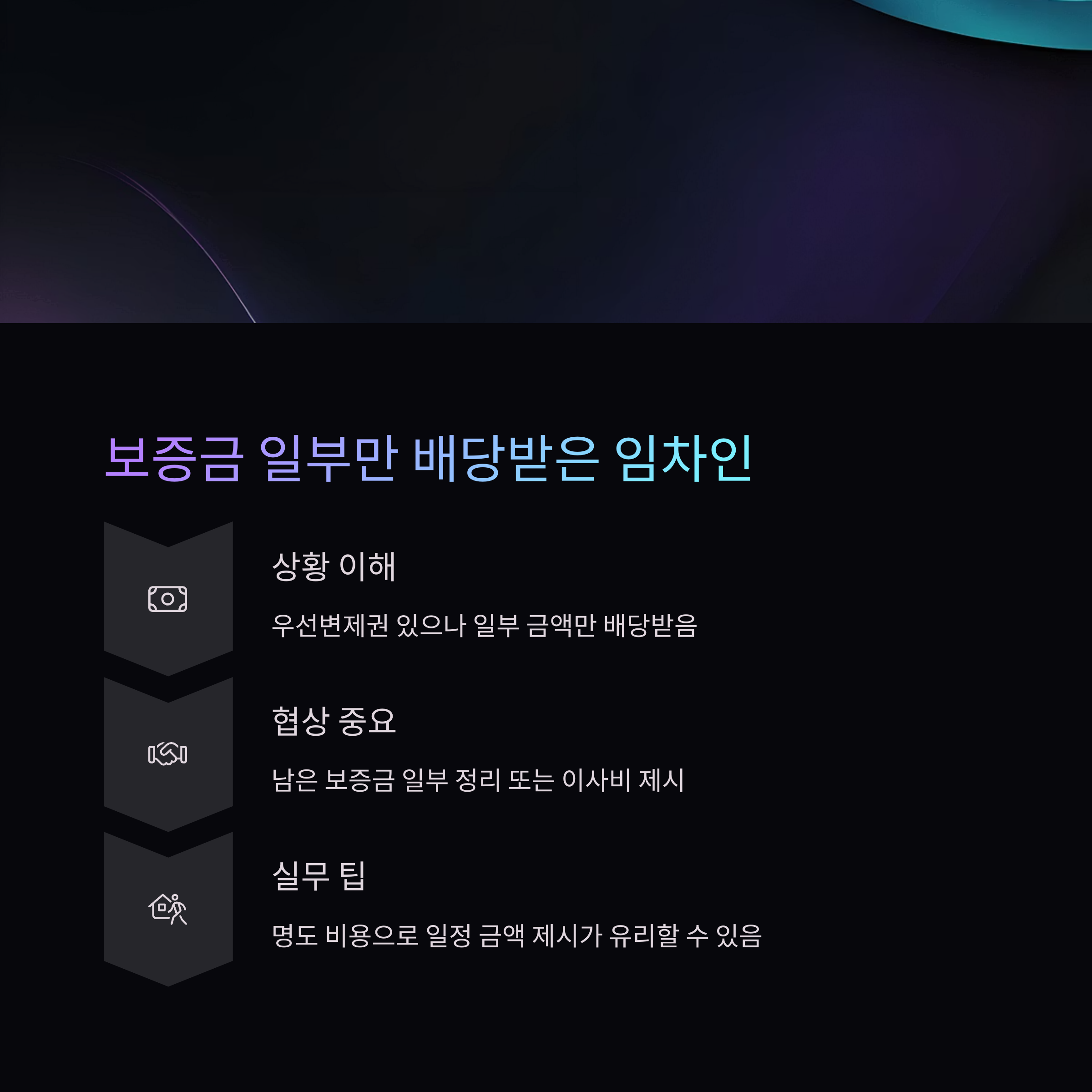 임차인이 우선변제권은 갖고 있었지만 배당 순위나 배당금 부족 등의 이유로 일부 금액만 배당받은 상황이다. 이 경우에도 임차인이 여전히 해당 부동산에 거주하고 있다면 남은 보증금을 돌려받지 못한 상태이므로 낙찰자에게 보증금 반환을 요구하거나 명도에 협조하지 않을 가능성이 있다. 이런 경우에는 임차인과의 협상이 중요하다. 예를 들어 명도 조건으로 남은 보증금 일부를 정리해주거나 이사비를 제시하는 방식으로 원만한 합의를 이끌어내야 한다. 실무에서는 명도 비용으로 일정 금액을 제시하고 빠르게 인도를 받는 것이 오히려 더 유리한 경우가 많다.
