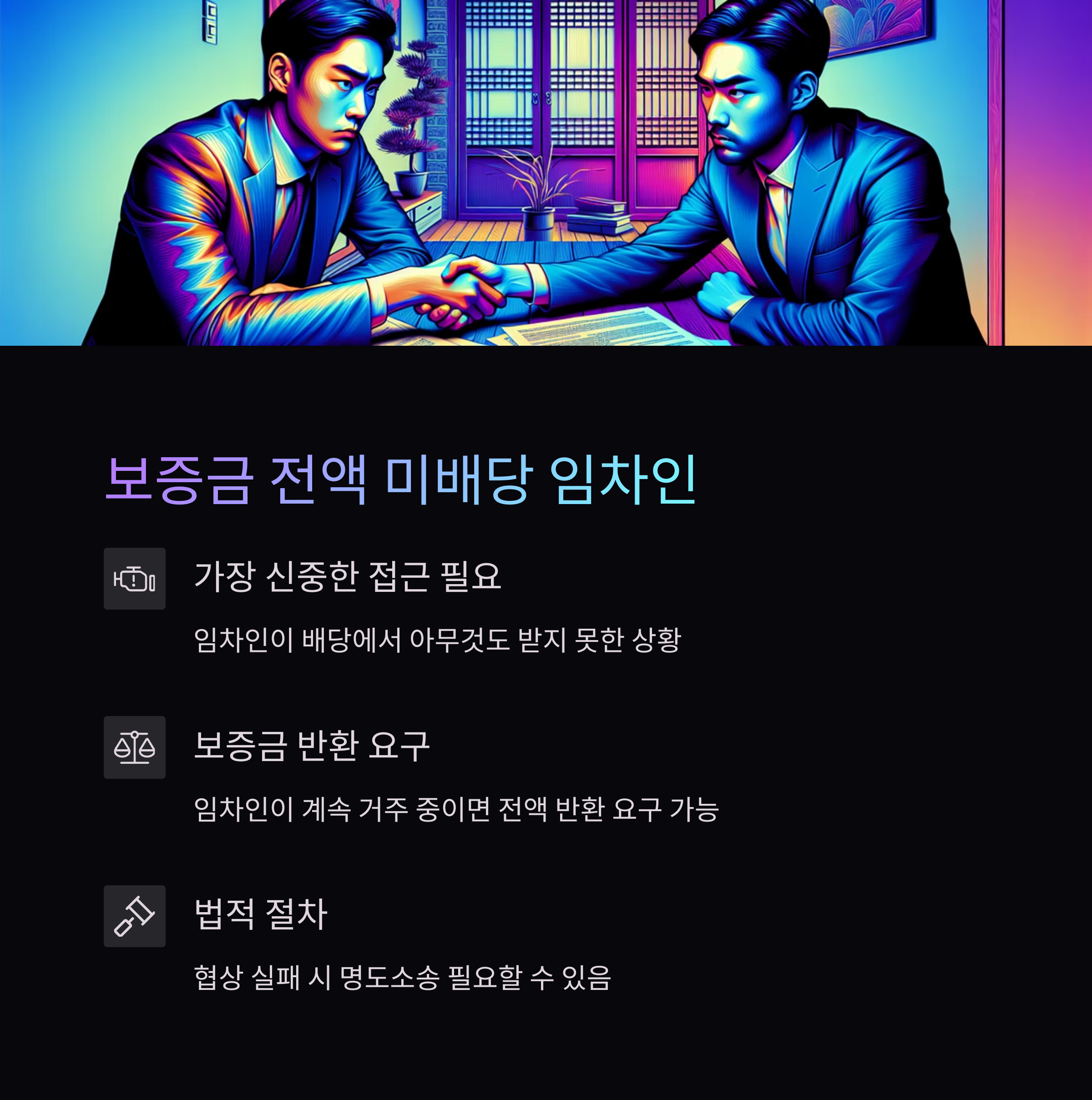 이 경우는 낙찰자 입장에서 가장 신중하게 접근해야 하는 상황이다. 특히 임차인이 소액보증금 기준에 해당하지 않거나 우선변제권이 아예 없었던 경우, 배당에서 아무것도 받지 못할 수 있다. 이때 임차인이 계속 거주 중이라면 보증금 전액에 대한 반환 요구가 있을 수 있으며, 이는 명도 협상 과정에서 매우 민감한 사안이 된다. 낙찰자는 경매 진행 전 현황조사서, 배당표, 전입세대 열람 등을 통해 임차인의 지위와 배당 여부를 꼼꼼히 확인해야 하며, 명도 협상을 위해 임차인의 입장도 고려해야 한다. 경우에 따라서는 명도소송을 진행해야 할 수도 있으나, 시간과 비용이 많이 들기 때문에 먼저 협상을 시도하는 것이 바람직하다.