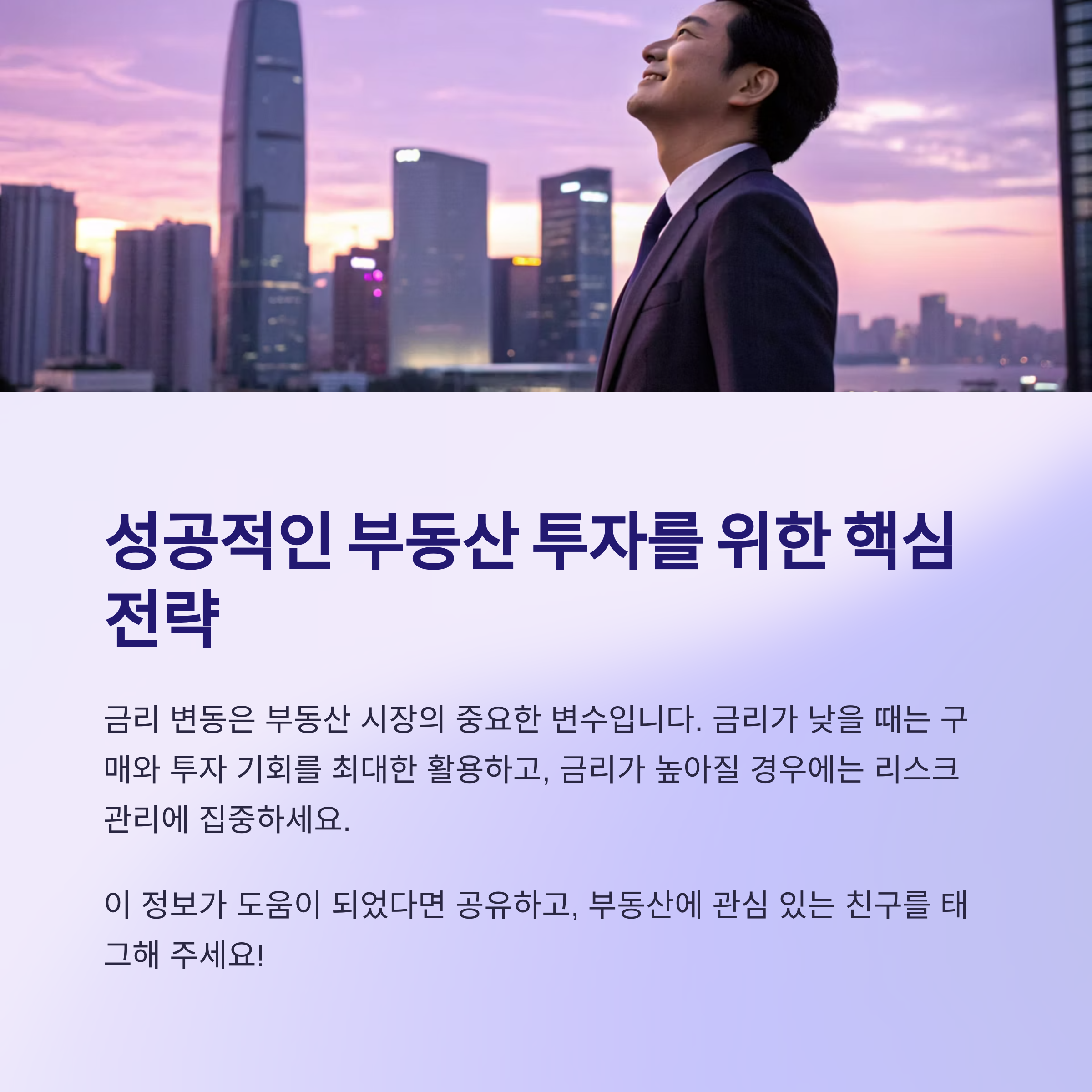 금리 변동은 부동산 시장의 중요한 변수로, 투자자들은 이를 신중하게 분석하고 대응 전략을 마련해야 합니다. 금리가 낮을 때는 구매와 투자의 기회를 최대한 활용하고, 금리가 높아질 경우에는 리스크 관리에 집중하는 것이 필요합니다. 이러한 전략적 접근은 부동산 투자에서 성공적인 결과를 가져올 수 있습니다.