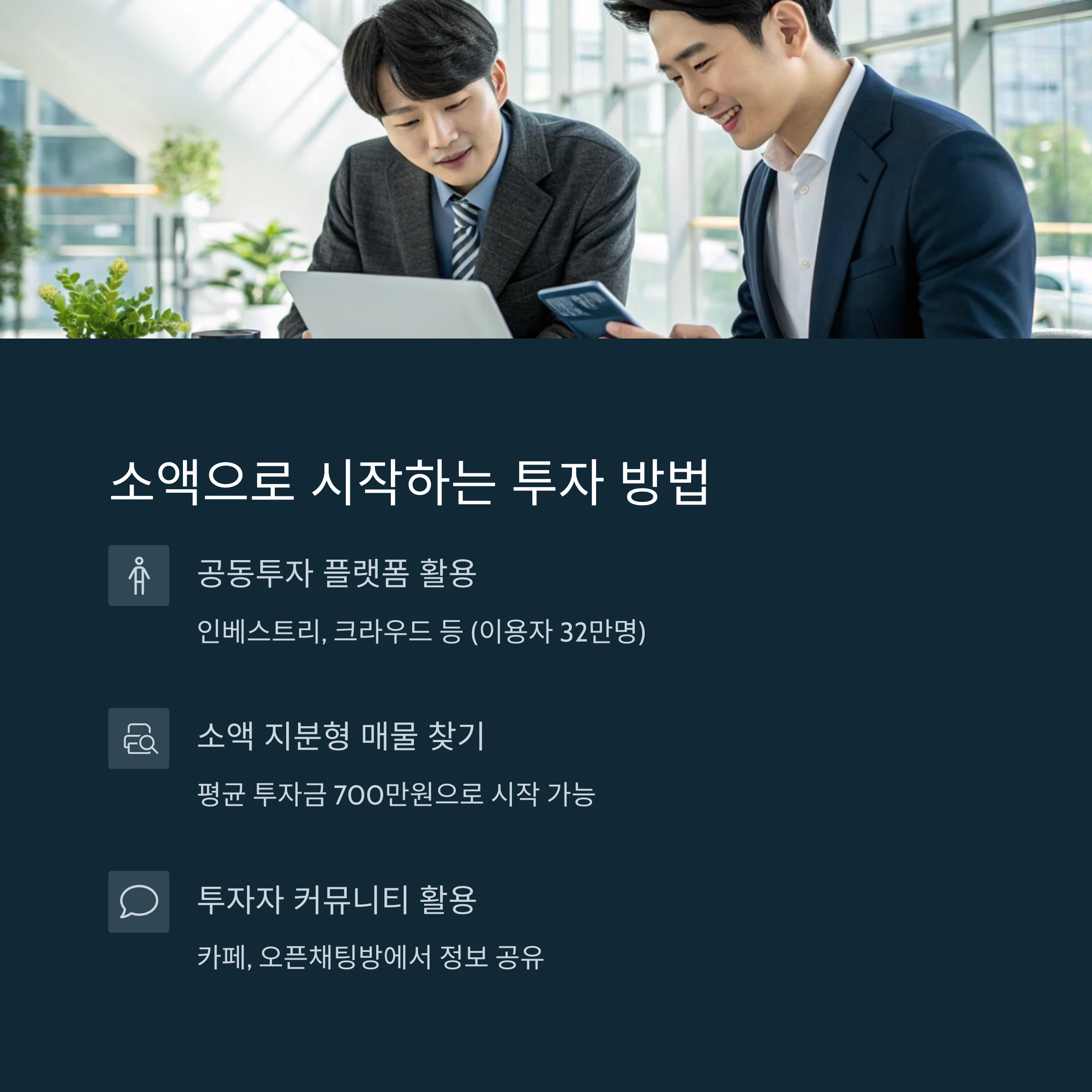 4. 소액 투자 는 공유하는곳도 많이 있으니  경험과 공부도 하고 수익를 극대화 하기 위해 직.간접투자도 여러분은 한번 해 보세요.