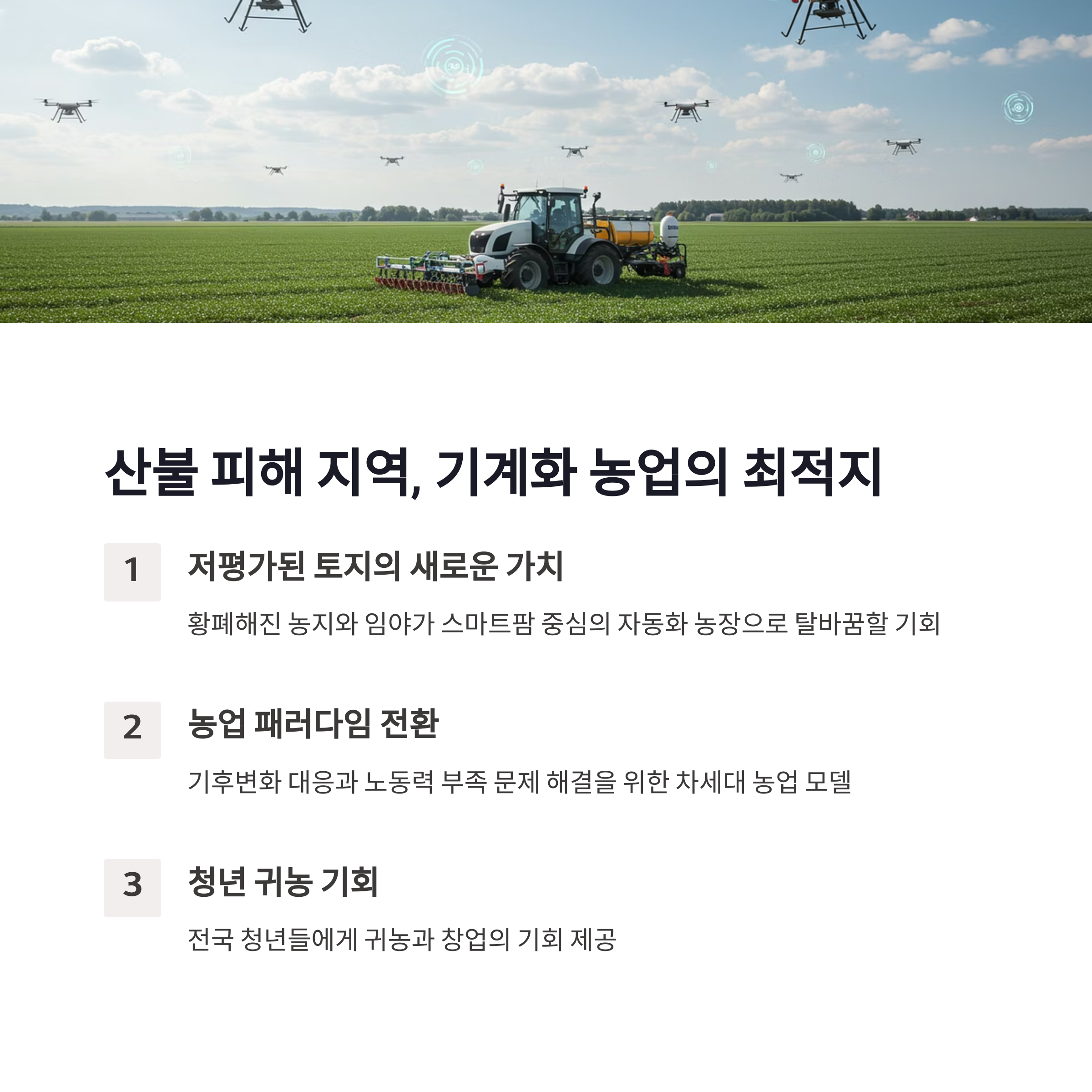산불로 인해 황폐해진 농지와 임야는 현재 저평가 상태에 머물러 있습니다. 그러나 이는 오히려 새로운 시작을 위한 기회가 될 수 있습니다. 정부와 지자체가 협력하여 이 땅에 기계화 기반의 농업단지, 스마트팜 중심의 자동화 농장을 조성한다면, 이 지역은 단순한 피해 회복을 넘어 농업의 패러다임을 전환하는 실험지대가 될 수 있습니다.