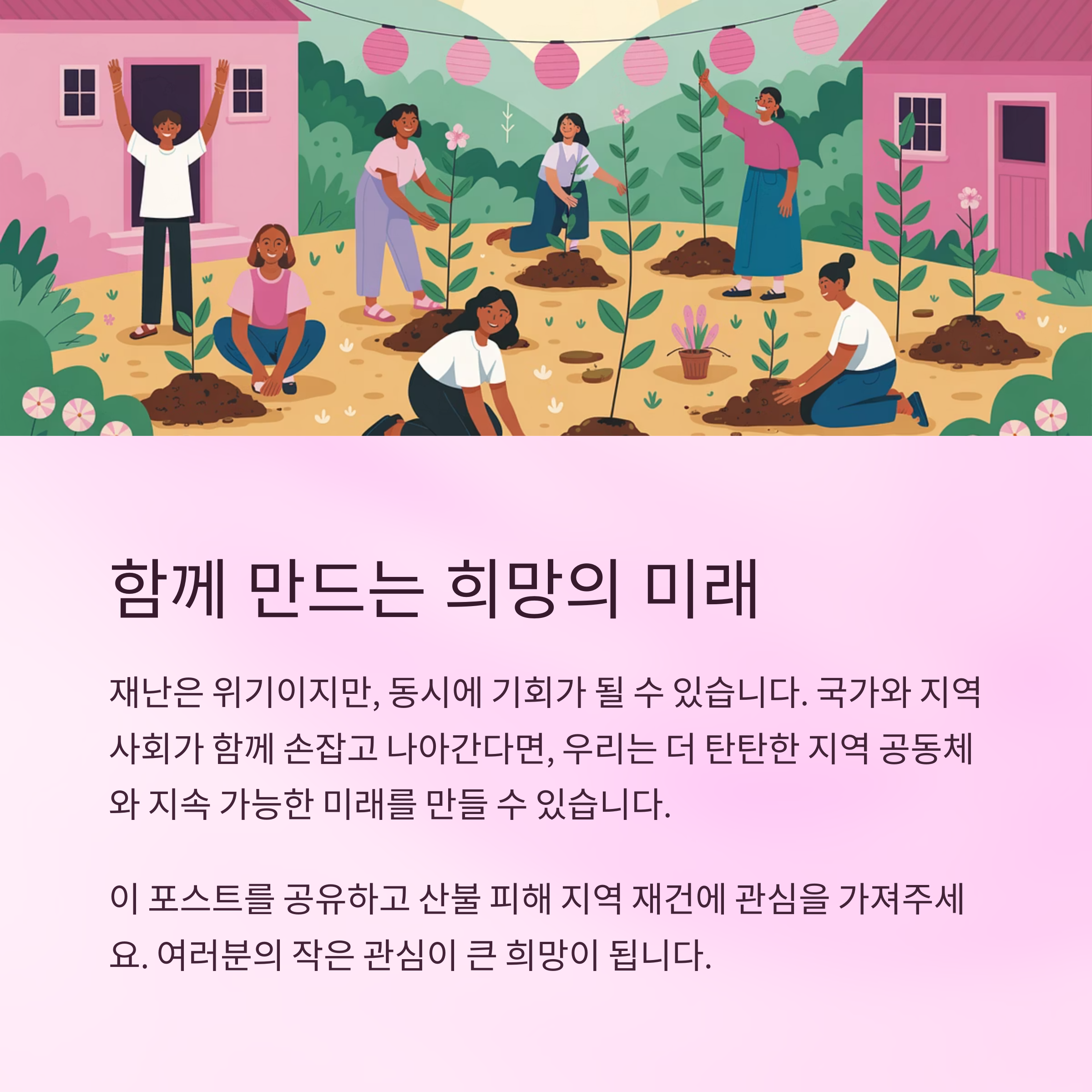 산불은 상처였지만, 이제는 희망의 씨앗이 될 수 있습니다. 지속 가능한 생태 회복과 주민 중심의 경제 재건을 통해 지역은 다시 살아날 것입니다.