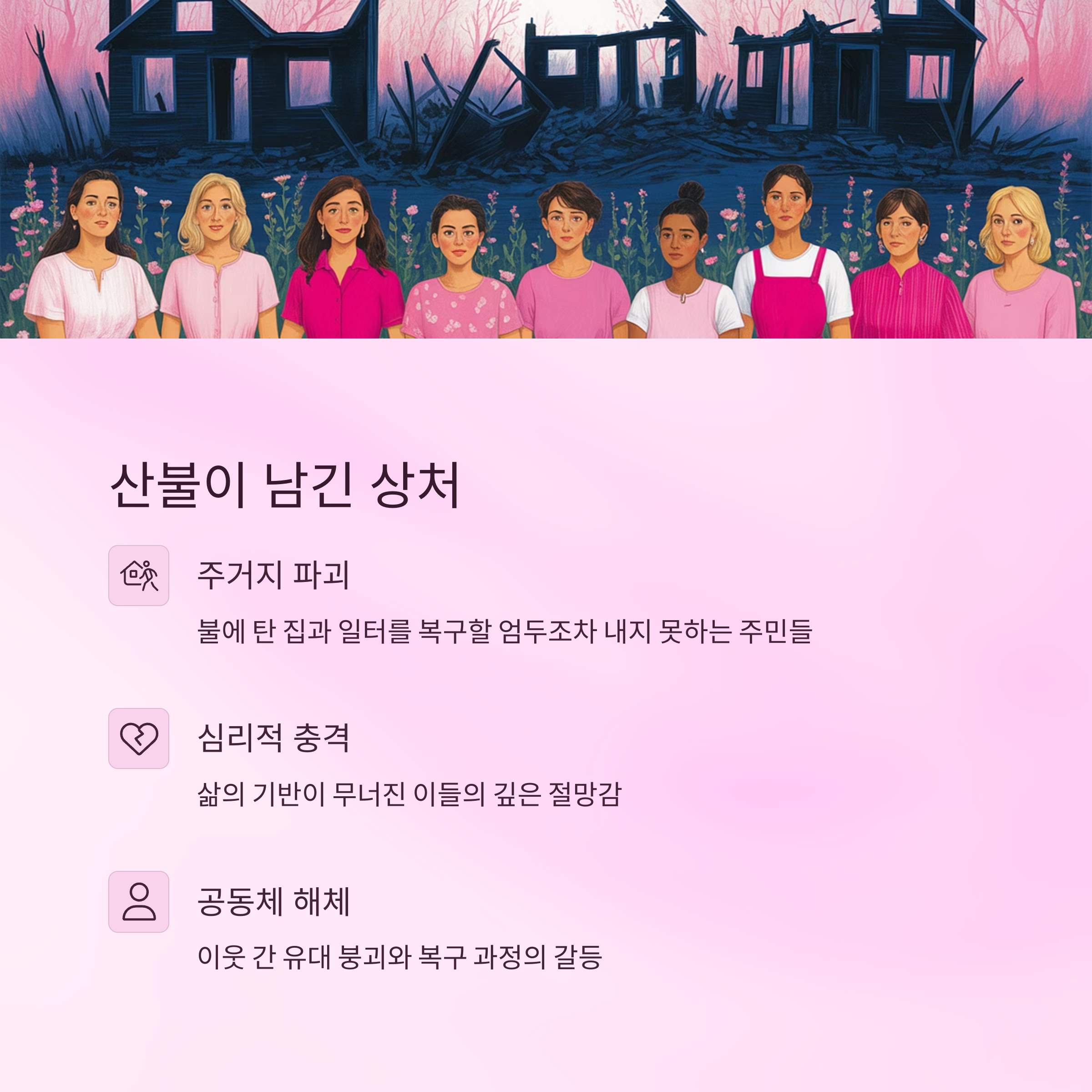 1. 산불 피해 이후, 절망과 희망이 교차하는 마을의 이야기