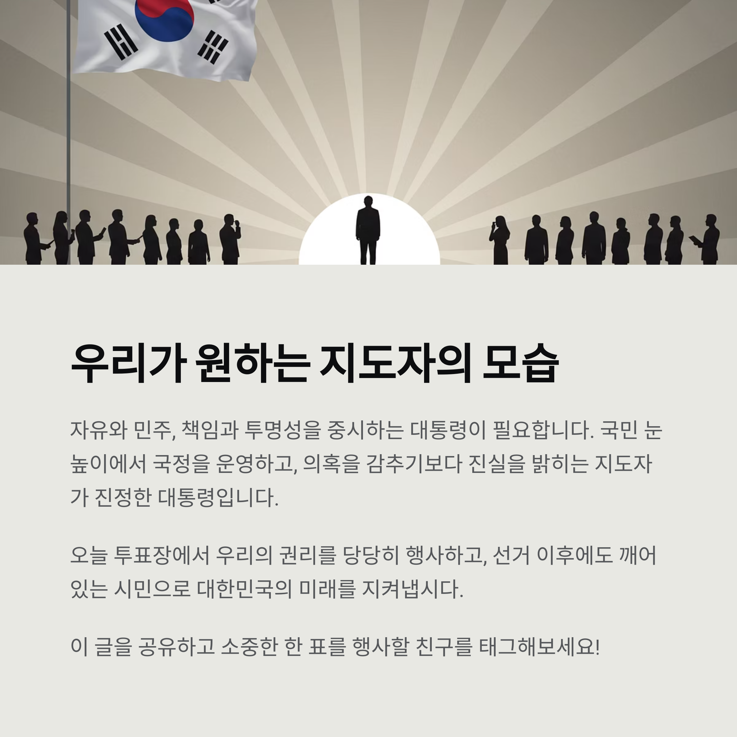 그리고 선거 이후에도 계속 깨어 있는 시민으로서 대한민국의 미래를 지켜냅시다.