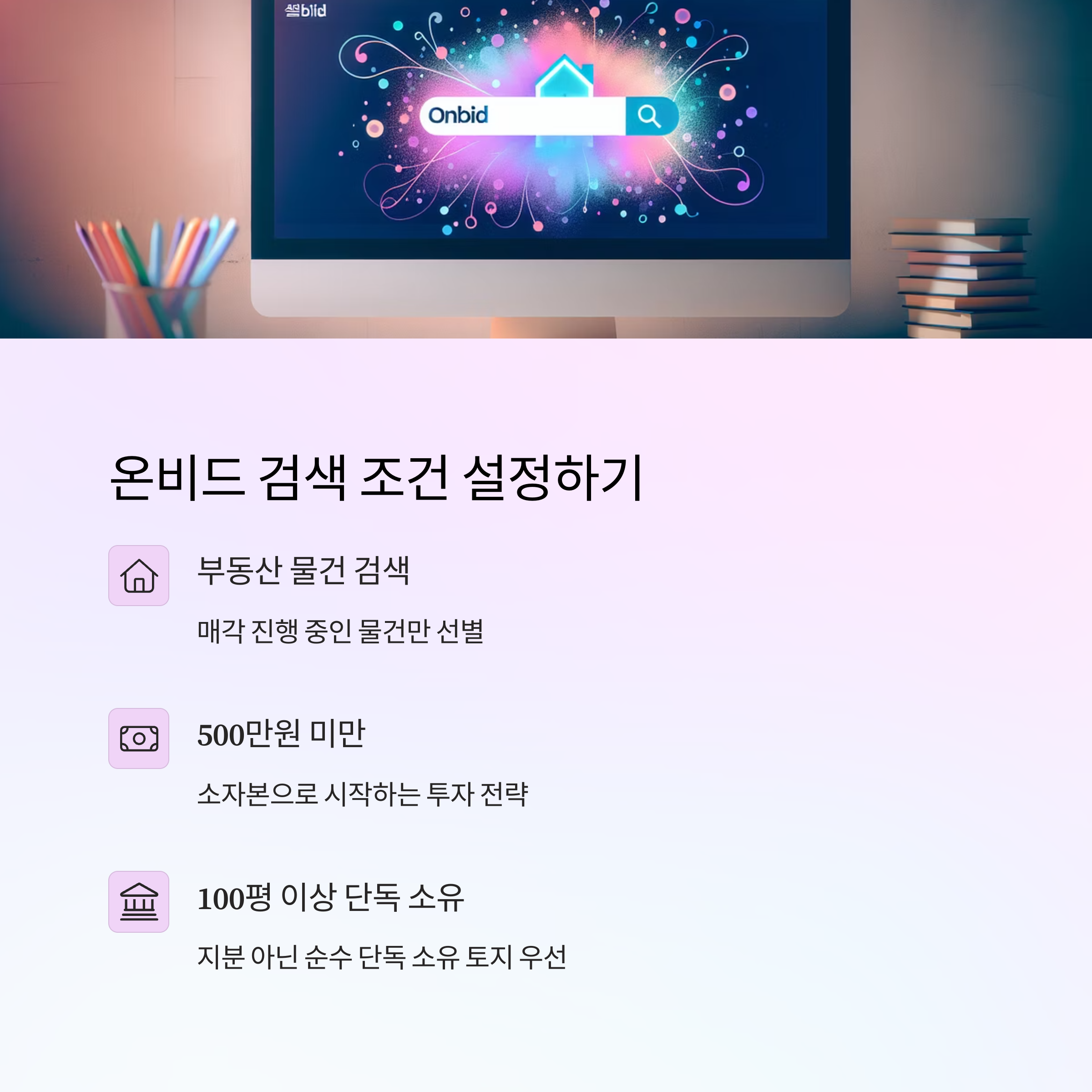부동산 경매와 공매를 통해 소자본으로 큰 수익을 창출하는 것은 많은 사람들의 꿈입니다. 특히, 온비드(OnBid) 플랫폼을 활용하여 조건 검색을 통해 적절한 물건을 찾아내는 것은 실전에서 필수적인 과정입니다. 이번 글에서는 '온비드 조건 검색으로 1억 만들기' 프로젝트의 첫 단계를 소개하며, 실전에서 어떤 조건을 활용하는지 구체적으로 설명드리겠습니다.