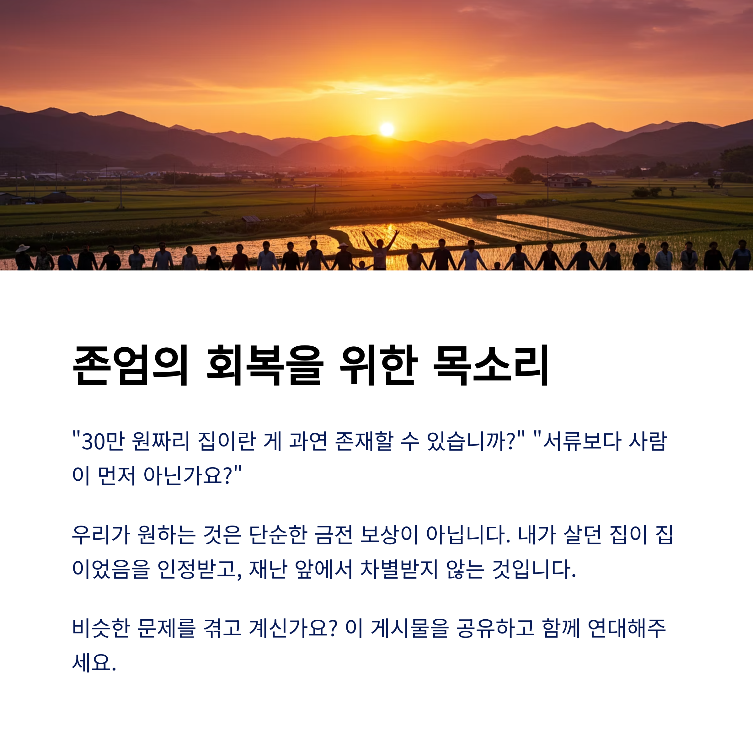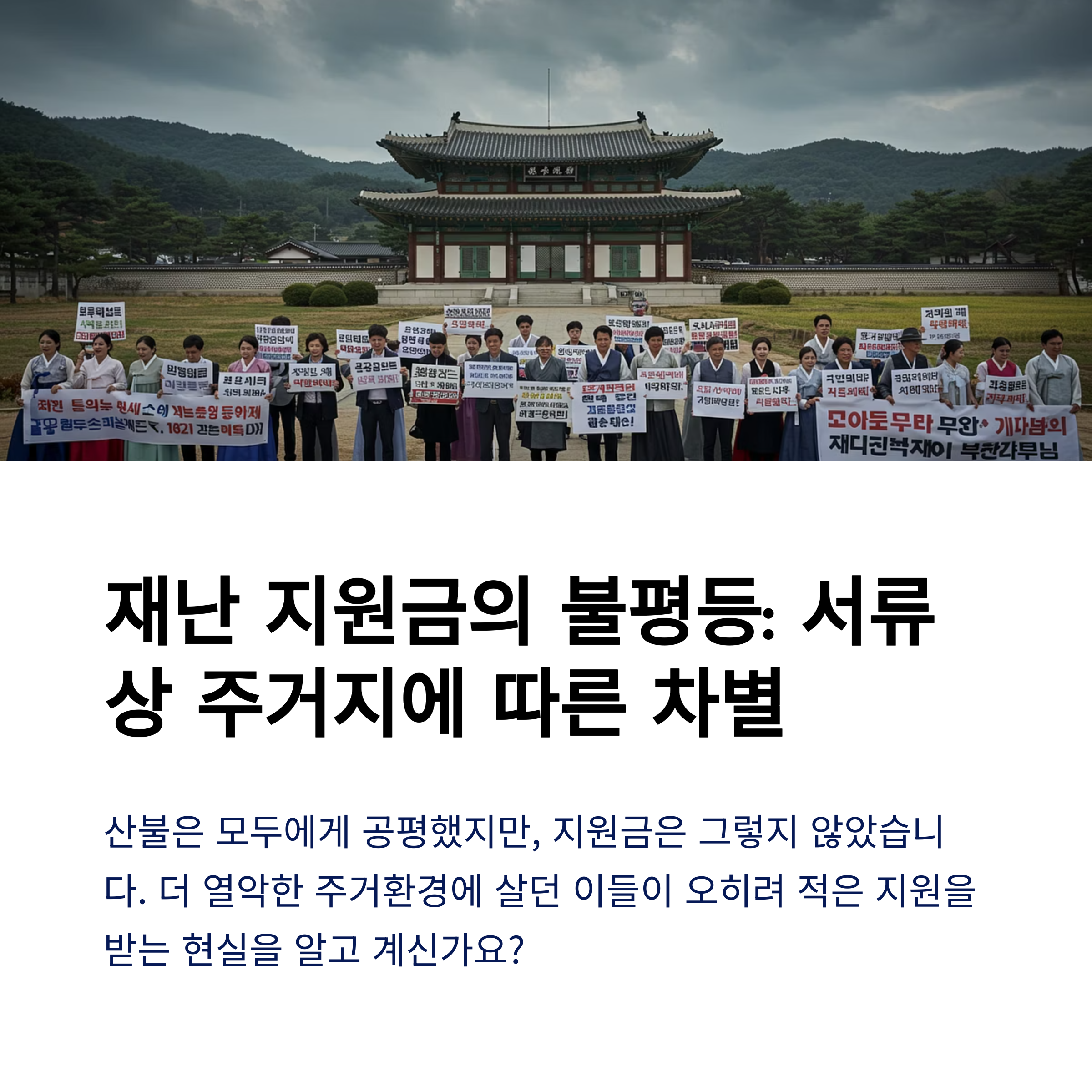 재난은 인간의 통제를 벗어난 자연의 현상입니다. 하지만 그 이후의 행정적 대응은 철저히 우리의 책임입니다. 더 열악한 주거 환경에서 더 큰 피해를 본 사람에게, 더 적은 지원을 하는 사회는 정의롭지 않습니다. 행정은 실거주 여부를 중심으로 판단해야 하며, 주거 형태의 다양성을 이제는 인정해야 할 때입니다.