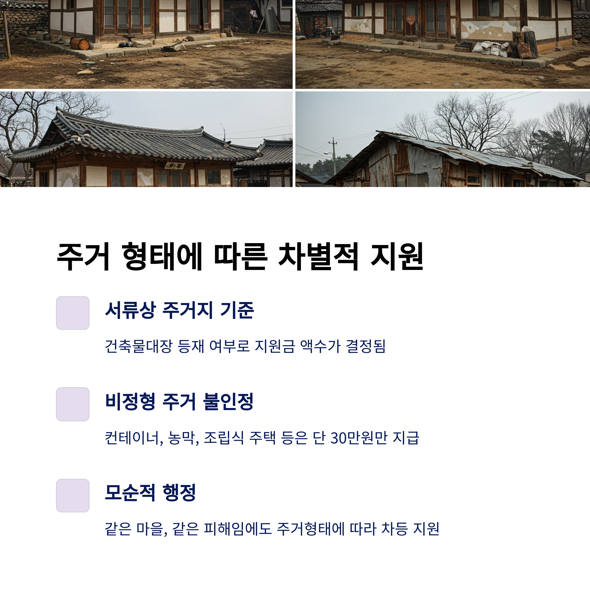 - 피해의 경중이 아닌, 건축물대장 등재 여부로 지원금 액수가 결정됨