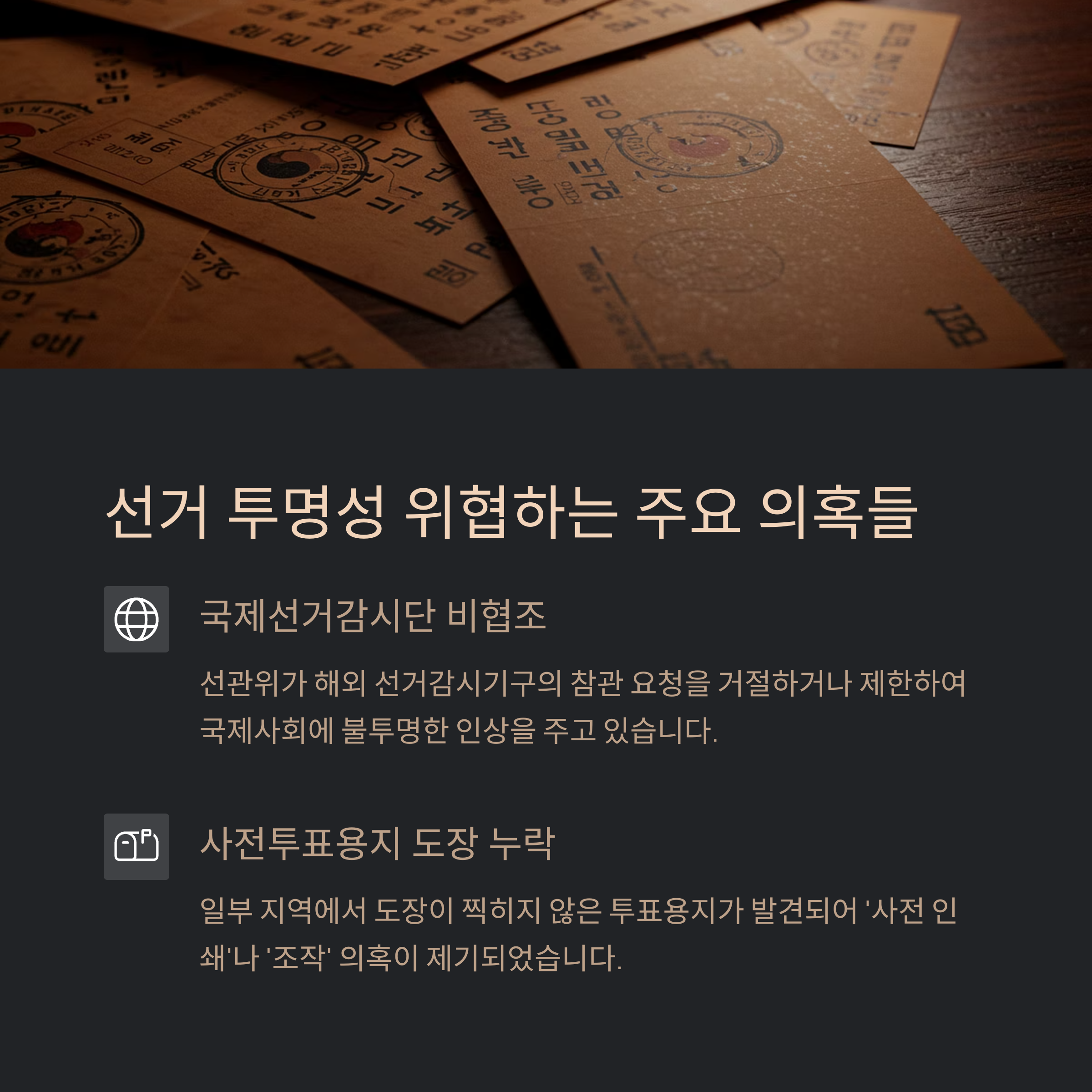 • 이는 무효표 처리 여부를 두고 혼란을 초래하며, 인쇄된 도장조차 없는 투표용지의 존재는 '사전 인쇄'나 '조작' 의혹까지 불러일으켰습니다.