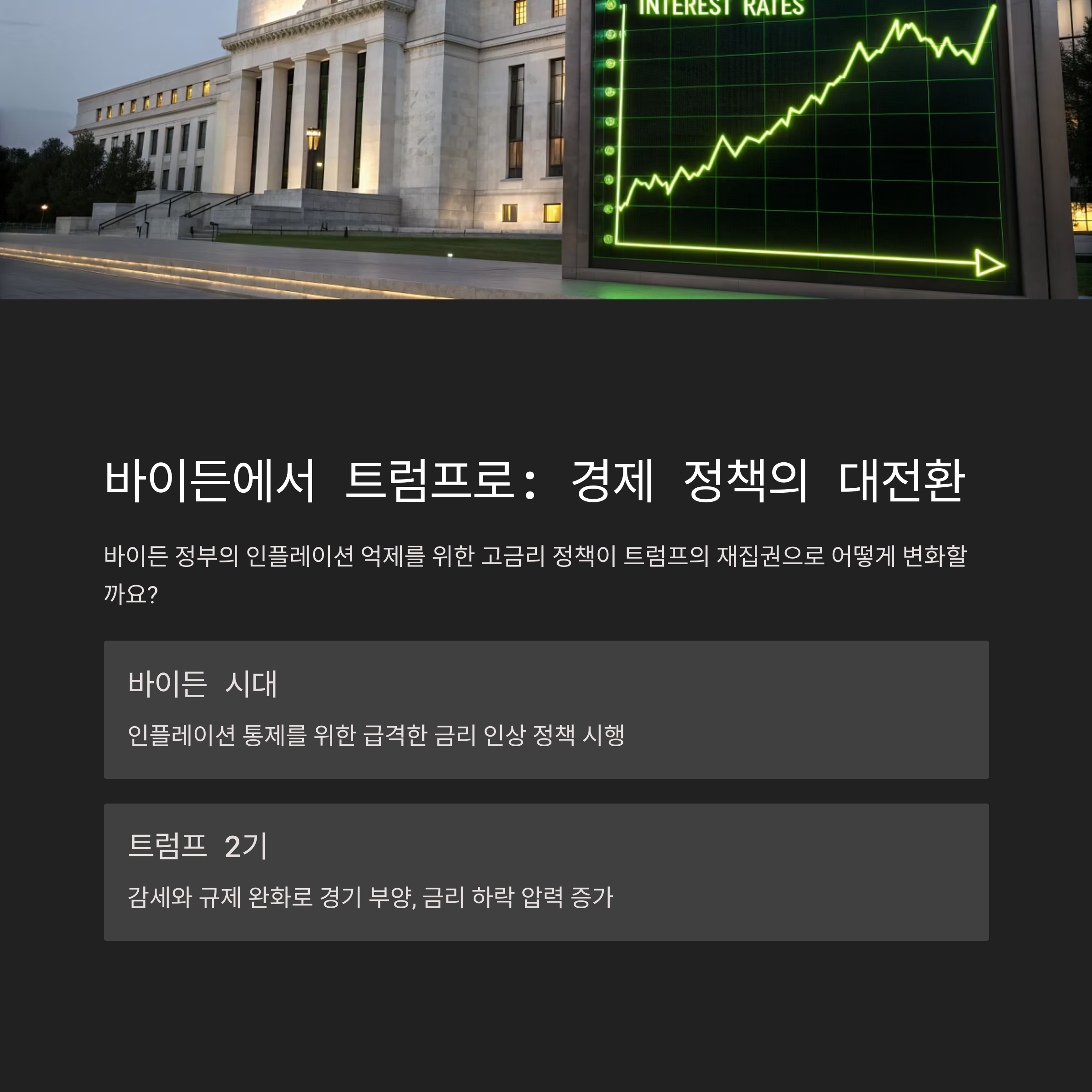 바이든 정부 시절, 높은 인플레이션을 잡기 위해 연준은 급격한 금리 인상을 단행했습니다. 그러나 2025년, 트럼프 전 대통령의 재집권이 확정되면서 경제 정책의 방향성이 급변하고 있습니다. 트럼프 행정부는 감세와 규제 완화를 앞세워 경기 부양을 목표로 삼고 있어, 이는 자연스럽게 금리 하락 압력으로 이어질 전망입니다.