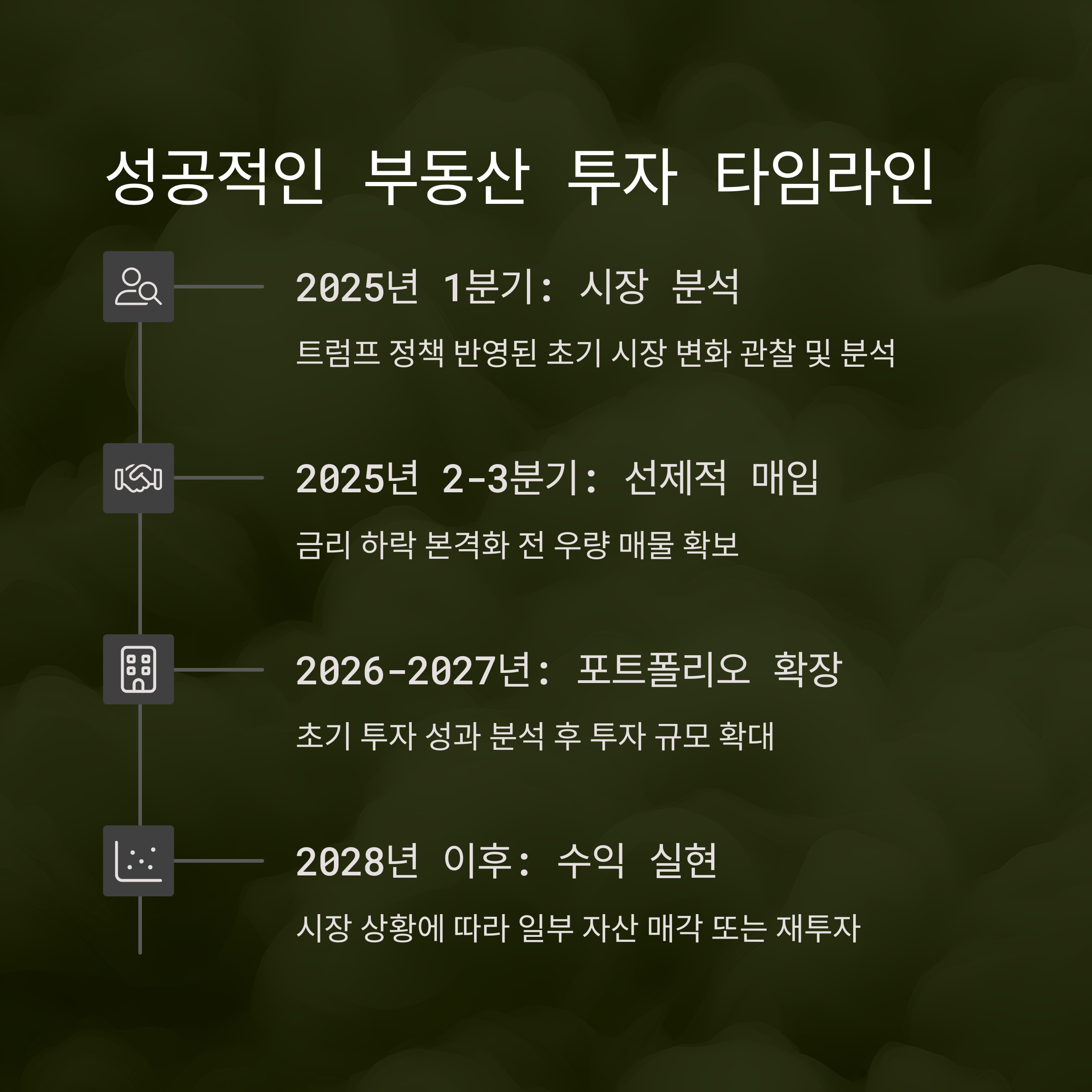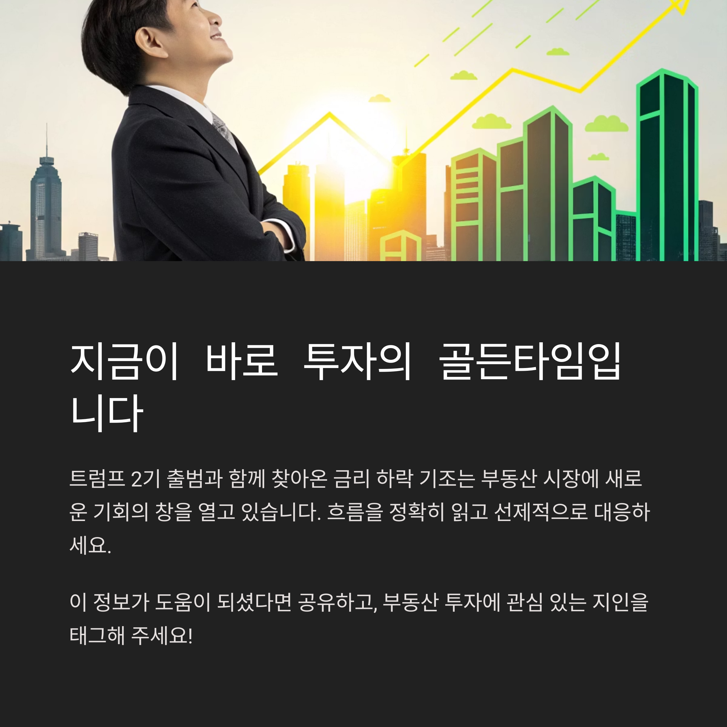 트럼프 2기의 출범은 금리 하락과 함께 새로운 부동산 투자 기회를 열고 있습니다. 흐름을 정확히 읽고 선제적으로 움직인다면, 앞으로 수년간 안정적이면서도 높은 수익을 기대할 수 있을 것입니다. 지금이 바로 적극적인 투자에 나설 최적의 타이밍입니다.