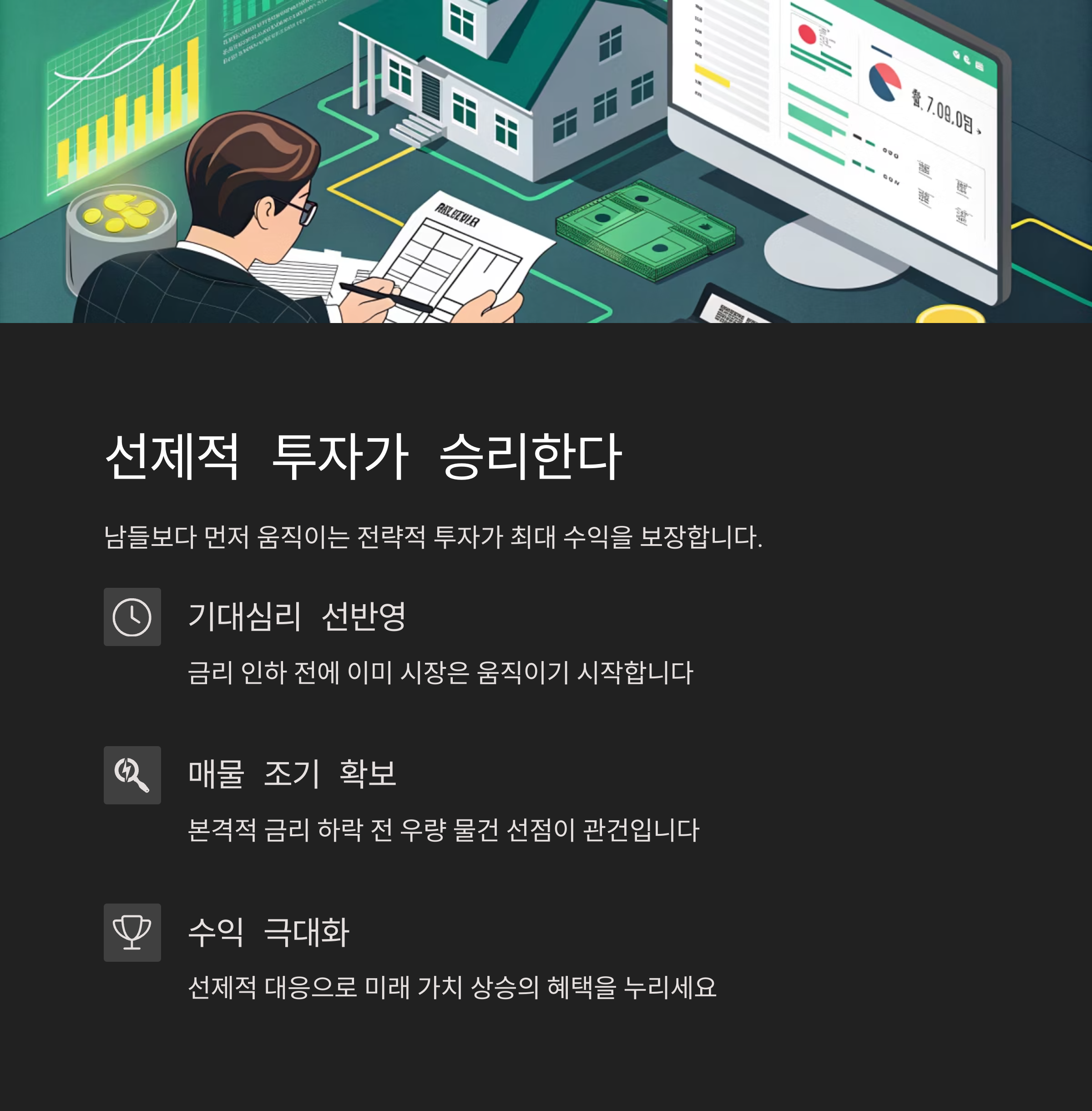 금리 인하 흐름이 시작되면 부동산 시장은 그 기대심리를 선반영하게 됩니다. 따라서 투자자는 남들보다 한 발 앞서 움직여야 합니다. 금리가 본격적으로 떨어지기 전, 투자 매물을 확보하는 것이 수익 극대화의 핵심 전략입니다.