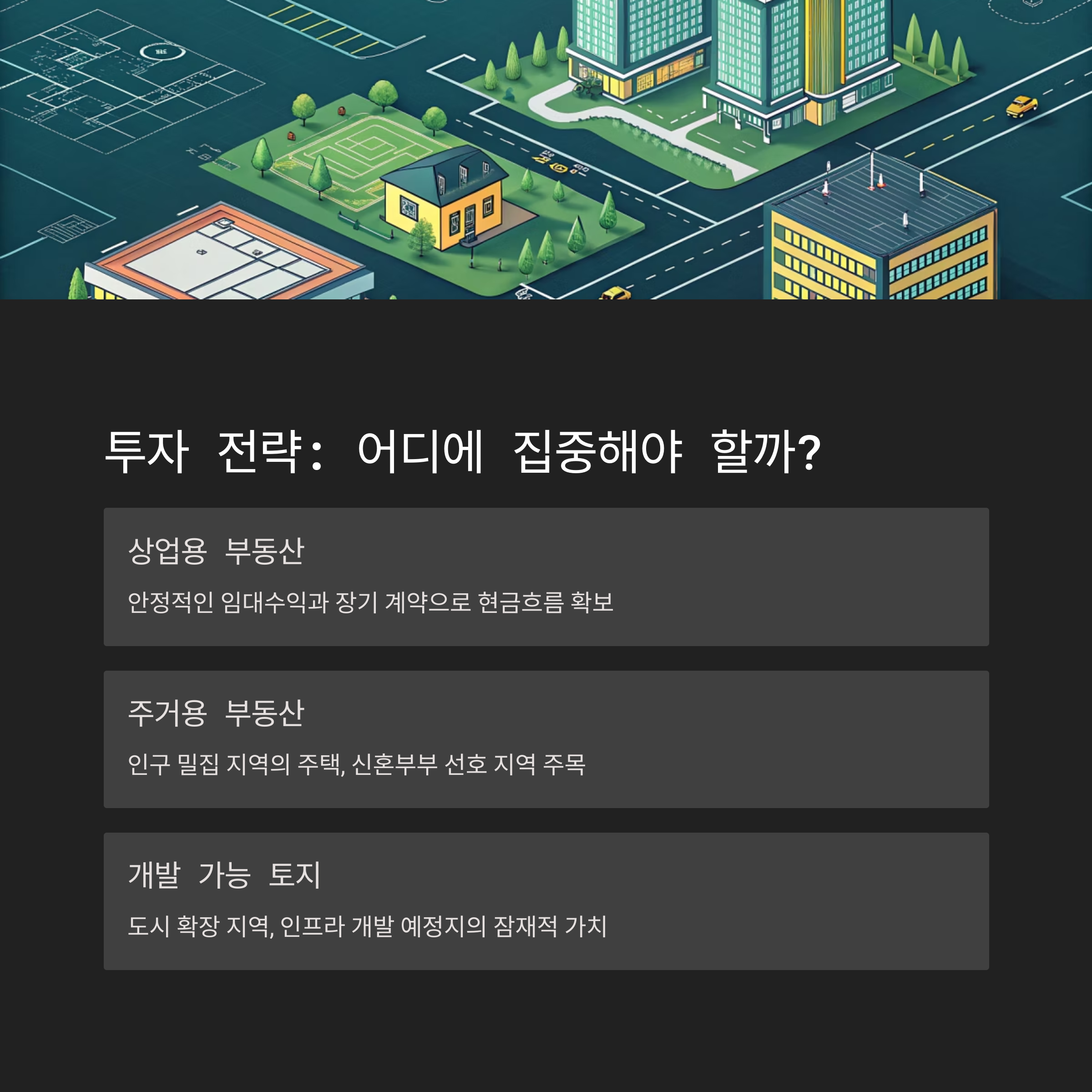 모든 시장에는 변수와 리스크가 존재합니다. 경기 둔화나 정책 변화에 대비해, 안정적인 임대수익을 기대할 수 있는 부동산과 성장 가능성이 높은 지역을 적절히 조합한 포트폴리오 구성이 필요합니다. 철저한 분석과 신중한 접근이 필수입니다.