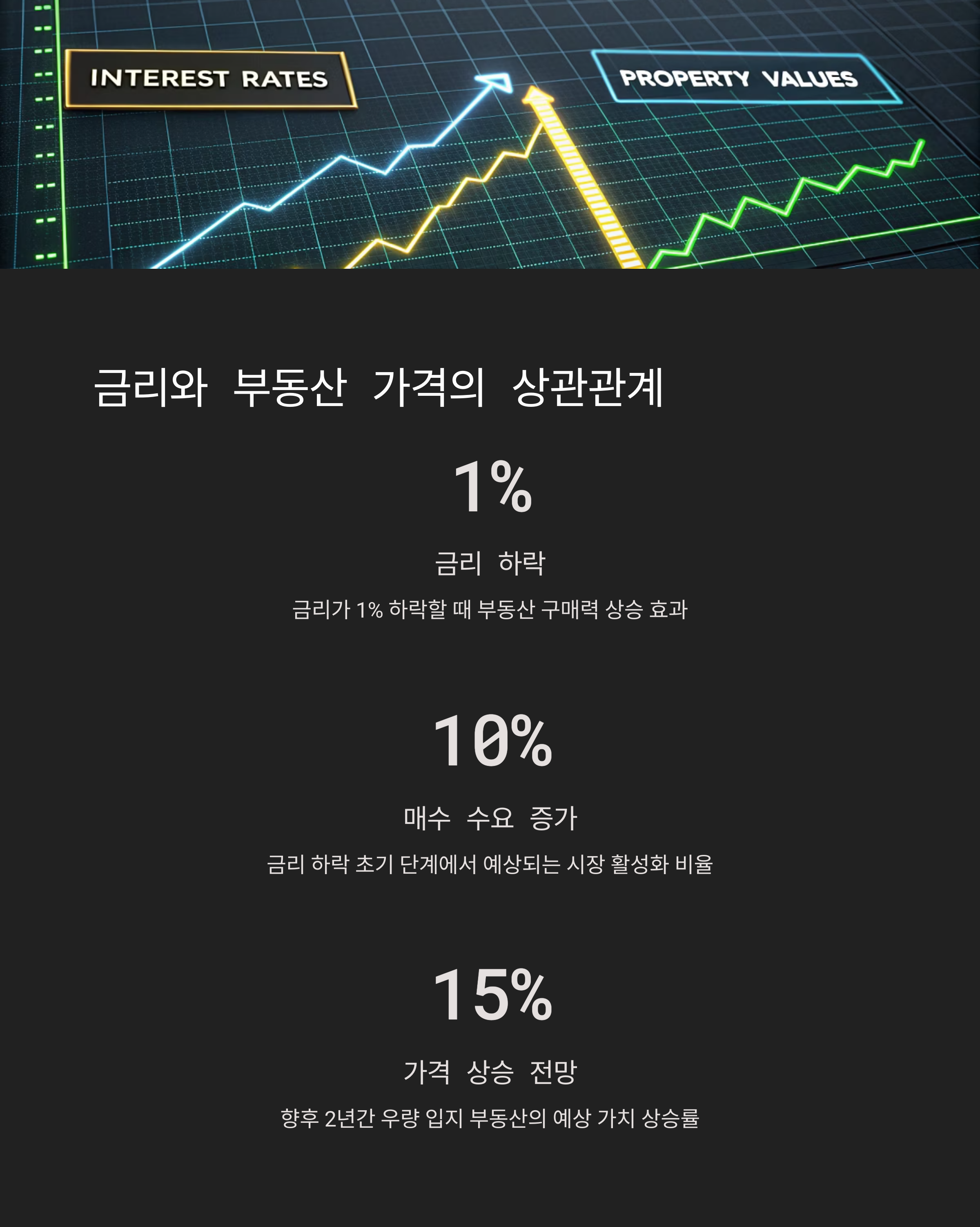 금리가 하락하면 대출이자 부담이 줄어들어 부동산 시장에 즉각적인 긍정적 영향을 미칩니다. 주택 구매 수요가 살아나고, 투자자들의 자금 유입이 가속화될 가능성이 큽니다. 특히 수익형 부동산이나 개발 가능성이 높은 지역의 부동산은 가격 상승 탄력을 받을 것입니다.